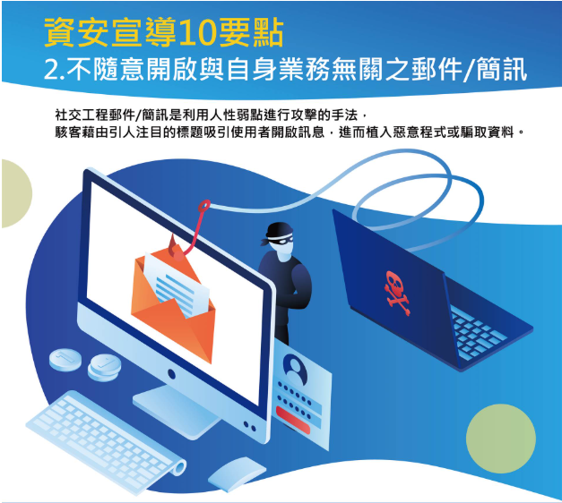 為防範社交工程攻擊,造成單位受駭、機密外洩,請長官及同仁注意並配合下列事項: